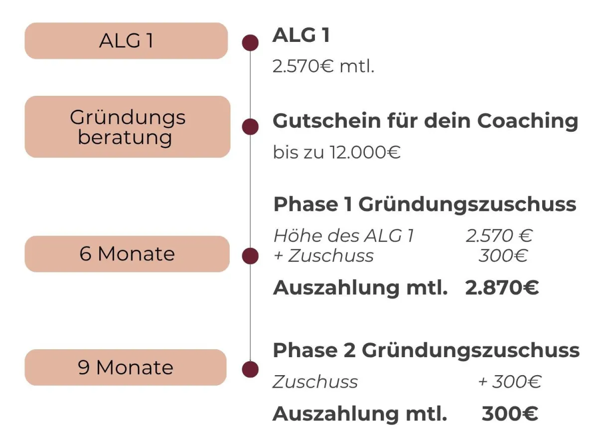 • 6 Monate Förderung in Höhe deines letzten ALG 1 + 300 € Zuschuss